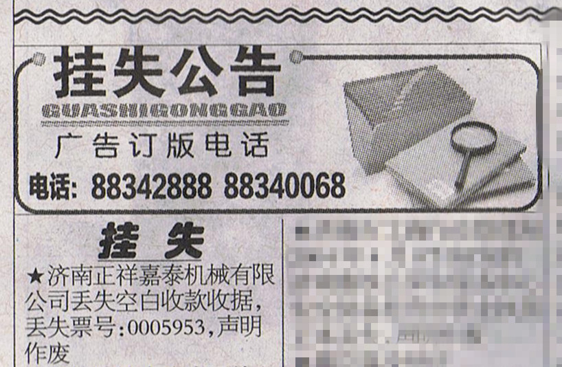 濟(jì)南正祥嘉泰機(jī)械有限公司 丟失空白收款收據(jù),丟失票號(hào):0005953,聲明作廢